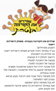 רצינו לעשות הקיץ לקראת היום הולדת היישובי שבוע הישרדות ביישוב. בהתחלה חשבתי לעשות 2 משימות בשבוע, אחת בחוץ, אחת בבית.. לאור המצב היום אני מבינה שהכל יהיה בבית.. אז משימה 1 היא לקחת מתכון שנשלח ולבצע אותו אחד ל-1 ואנחנו נטעם ממנו. וכל משפחה שתשתתף תקבל צ’ופר קטן. משימה 2 משימת מבוך. אני הולכת ליצור מבוכים מקרטון ולהכניס גולות ולהביא לכל משפחה, משפחה שתצלם לי סרטון שלהם פותרים את המבוך תקבל ניקוד. וכו’ וכו’…