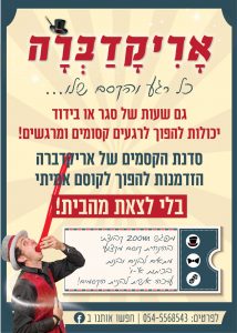ליצן /להטוטן אריקדברא, הוא קוסם ועושה סדנאות בלונים, הוא גם שר ומנגן